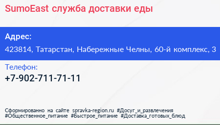SumoEast, служба доставки еды по адресу 423814, Татарстан, Набережные Челны, 60-й комплекс, 3 в дальнейшем Организация, размещена в следующих категориях: