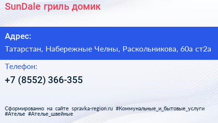 SunDale, гриль-домик по адресу Татарстан, Набережные Челны, Раскольникова, 60а ст2а в дальнейшем Организация, размещена в следующих категориях: