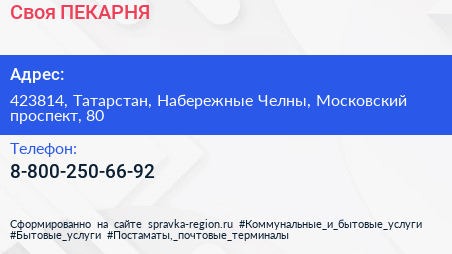 Своя ПЕКАРНЯ по адресу 423814, Татарстан, Набережные Челны, Московский проспект, 80 в дальнейшем Организация, размещена в следующих категориях: