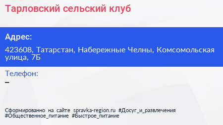 Тарловский сельский клуб по адресу 423608, Татарстан, Набережные Челны, Комсомольская улица, 7Б в дальнейшем Организация, размещена в следующих категориях: