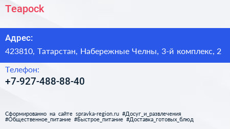 Teapock по адресу 423810, Татарстан, Набережные Челны, 3-й комплекс, 2 в дальнейшем Организация, размещена в следующих категориях: