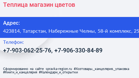 Теплица, магазин цветов по адресу 423814, Татарстан, Набережные Челны, 58-й комплекс, 25 в дальнейшем Организация, размещена в следующих категориях: