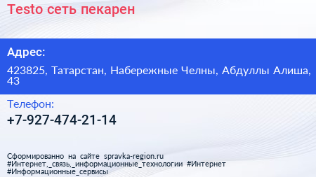 Testo, сеть пекарен по адресу 423825, Татарстан, Набережные Челны, Абдуллы Алиша, 43 в дальнейшем Организация, размещена в следующих категориях: