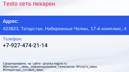 Testo, сеть пекарен по адресу 423823, Татарстан, Набережные Челны, 17-й комплекс, 4 в дальнейшем Организация, размещена в следующих категориях: