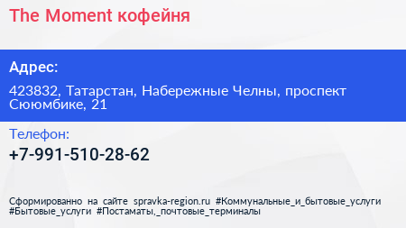 The Moment, кофейня по адресу 423832, Татарстан, Набережные Челны, проспект Сююмбике, 21 в дальнейшем Организация, размещена в следующих категориях: