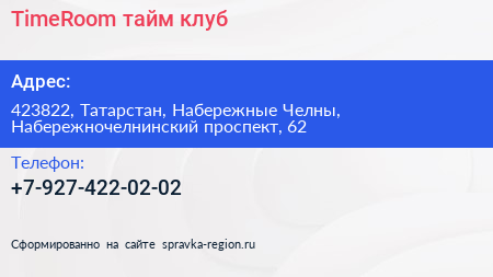 TimeRoom, тайм-клуб по адресу 423822, Татарстан, Набережные Челны, Набережночелнинский проспект, 62 в дальнейшем Организация, размещена в следующих категориях: