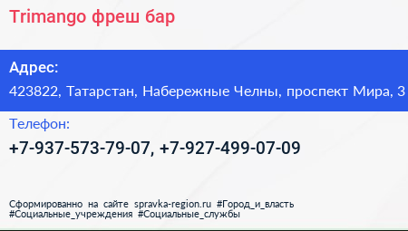 Trimango, фреш-бар по адресу 423822, Татарстан, Набережные Челны, проспект Мира, 3 в дальнейшем Организация, размещена в следующих категориях: