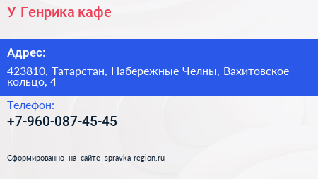 У Генрика, кафе по адресу 423810, Татарстан, Набережные Челны, Вахитовское кольцо, 4 в дальнейшем Организация, размещена в следующих категориях: