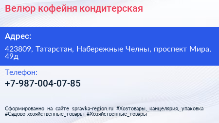 Велюр, кофейня-кондитерская по адресу 423809, Татарстан, Набережные Челны, проспект Мира, 49д в дальнейшем Организация, размещена в следующих категориях: