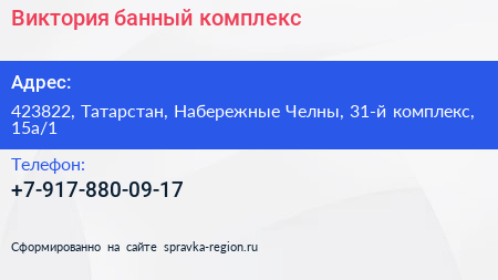 Виктория, банный комплекс по адресу 423822, Татарстан, Набережные Челны, 31-й комплекс, 15а/1 в дальнейшем Организация, размещена в следующих категориях: