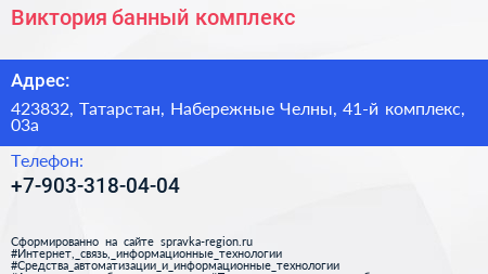 Виктория, банный комплекс по адресу 423832, Татарстан, Набережные Челны, 41-й комплекс, 03а в дальнейшем Организация, размещена в следующих категориях: