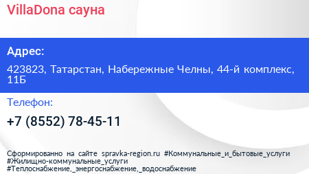 VillaDona, сауна по адресу 423823, Татарстан, Набережные Челны, 44-й комплекс, 11Б в дальнейшем Организация, размещена в следующих категориях: