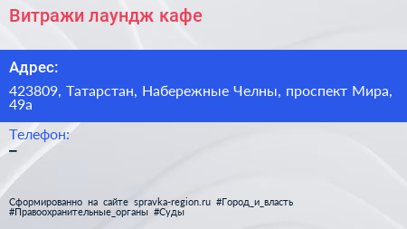 Витражи, лаундж-кафе по адресу 423809, Татарстан, Набережные Челны, проспект Мира, 49а в дальнейшем Организация, размещена в следующих категориях: