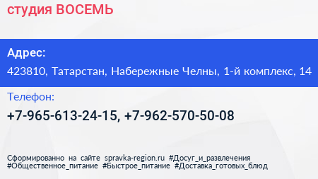 студия ВОСЕМЬ по адресу 423810, Татарстан, Набережные Челны, 1-й комплекс, 14 в дальнейшем Организация, размещена в следующих категориях: