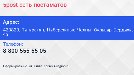 5post, сеть постаматов по адресу 423823, Татарстан, Набережные Челны, бульвар Бердаха, 4а в дальнейшем Организация, размещена в следующих категориях: