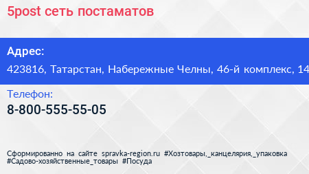 5post, сеть постаматов по адресу 423816, Татарстан, Набережные Челны, 46-й комплекс, 14 в дальнейшем Организация, размещена в следующих категориях: