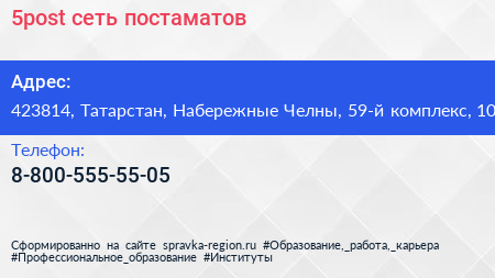 5post, сеть постаматов по адресу 423814, Татарстан, Набережные Челны, 59-й комплекс, 10 в дальнейшем Организация, размещена в следующих категориях: