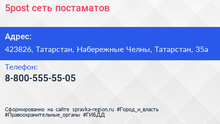 5post, сеть постаматов по адресу 423826, Татарстан, Набережные Челны, Татарстан, 35а в дальнейшем Организация, размещена в следующих категориях: