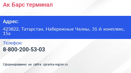 Ак Барс, терминал по адресу 423822, Татарстан, Набережные Челны, 31-й комплекс, 15а в дальнейшем Организация, размещена в следующих категориях:
