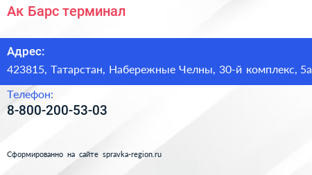 Ак Барс, терминал по адресу 423815, Татарстан, Набережные Челны, 30-й комплекс, 5а в дальнейшем Организация, размещена в следующих категориях: