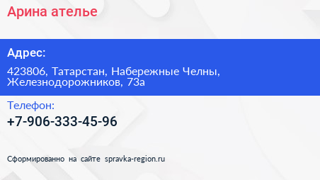 Арина, ателье по адресу 423806, Татарстан, Набережные Челны, Железнодорожников, 73а в дальнейшем Организация, размещена в следующих категориях: