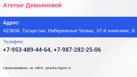 Ателье Демьяновой по адресу 423838, Татарстан, Набережные Челны, 37-й комплекс, 8 в дальнейшем Организация, размещена в следующих категориях:
