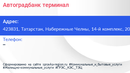 Автоградбанк, терминал по адресу 423831, Татарстан, Набережные Челны, 14-й комплекс, 20 в дальнейшем Организация, размещена в следующих категориях: