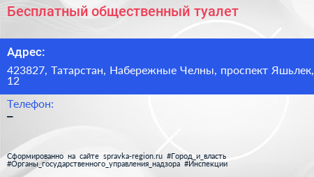 Бесплатный общественный туалет по адресу 423827, Татарстан, Набережные Челны, проспект Яшьлек, 12 в дальнейшем Организация, размещена в следующих категориях: