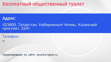 Бесплатный общественный туалет по адресу 423800, Татарстан, Набережные Челны, Казанский проспект, 224т в дальнейшем Организация, размещена в следующих категориях: