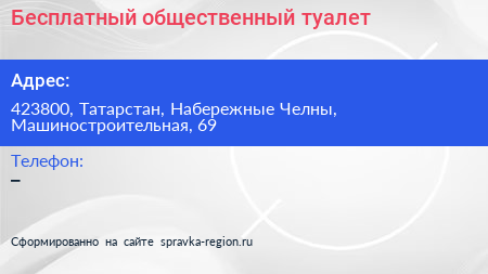 Бесплатный общественный туалет по адресу 423800, Татарстан, Набережные Челны, Машиностроительная, 69 в дальнейшем Организация, размещена в следующих категориях: