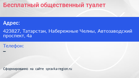 Бесплатный общественный туалет по адресу 423827, Татарстан, Набережные Челны, Автозаводский проспект, 4а в дальнейшем Организация, размещена в следующих категориях: