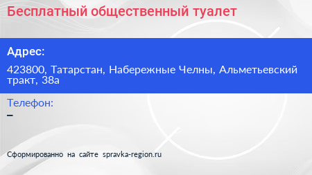 Бесплатный общественный туалет по адресу 423800, Татарстан, Набережные Челны, Альметьевский тракт, 38а в дальнейшем Организация, размещена в следующих категориях: