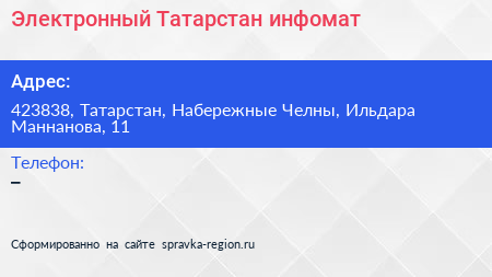 Электронный Татарстан, инфомат по адресу 423838, Татарстан, Набережные Челны, Ильдара Маннанова, 11 в дальнейшем Организация, размещена в следующих категориях: