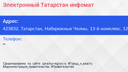 Электронный Татарстан, инфомат по адресу 423832, Татарстан, Набережные Челны, 13-й комплекс, 12 в дальнейшем Организация, размещена в следующих категориях: