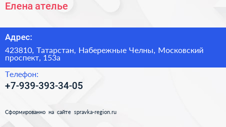 Елена, ателье по адресу 423810, Татарстан, Набережные Челны, Московский проспект, 153а в дальнейшем Организация, размещена в следующих категориях: