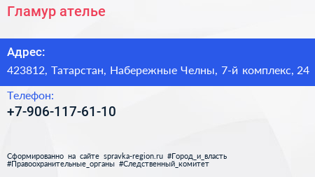 Гламур, ателье по адресу 423812, Татарстан, Набережные Челны, 7-й комплекс, 24 в дальнейшем Организация, размещена в следующих категориях: