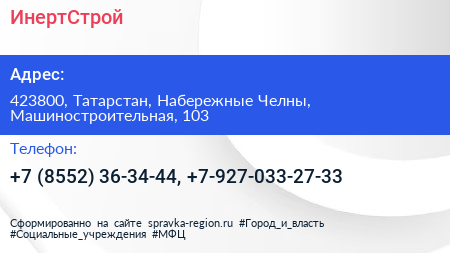 ИнертСтрой по адресу 423800, Татарстан, Набережные Челны, Машиностроительная, 103 в дальнейшем Организация, размещена в следующих категориях: