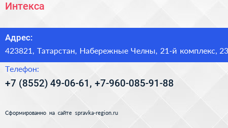 Интекса по адресу 423821, Татарстан, Набережные Челны, 21-й комплекс, 23 в дальнейшем Организация, размещена в следующих категориях: