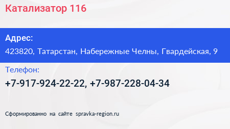 Катализатор-116 по адресу 423820, Татарстан, Набережные Челны, Гвардейская, 9 в дальнейшем Организация, размещена в следующих категориях: