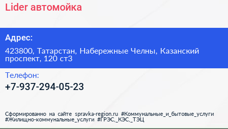 Lider, автомойка по адресу 423800, Татарстан, Набережные Челны, Казанский проспект, 120 ст3 в дальнейшем Организация, размещена в следующих категориях: