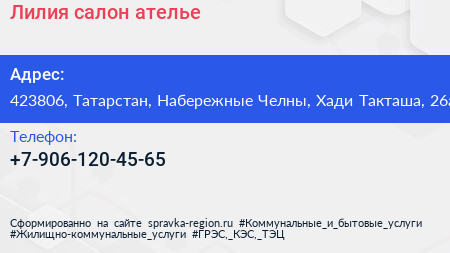 Лилия, салон-ателье по адресу 423806, Татарстан, Набережные Челны, Хади Такташа, 26а в дальнейшем Организация, размещена в следующих категориях: