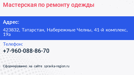 Мастерская по ремонту одежды по адресу 423832, Татарстан, Набережные Челны, 41-й комплекс, 19а в дальнейшем Организация, размещена в следующих категориях: