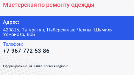 Мастерская по ремонту одежды по адресу 423816, Татарстан, Набережные Челны, Шамиля Усманова, 80Б в дальнейшем Организация, размещена в следующих категориях: