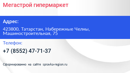 Мегастрой, гипермаркет по адресу 423800, Татарстан, Набережные Челны, Машиностроительная, 75 в дальнейшем Организация, размещена в следующих категориях: