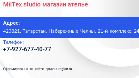 MilTex studio, магазин-ателье по адресу 423821, Татарстан, Набережные Челны, 21-й комплекс, 24 в дальнейшем Организация, размещена в следующих категориях: