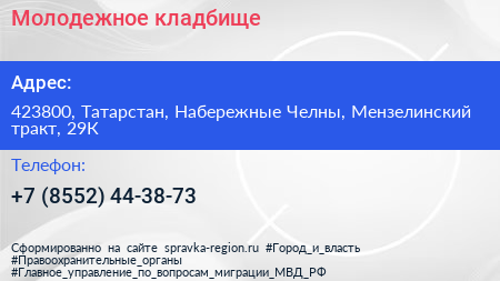 Молодежное, кладбище по адресу 423800, Татарстан, Набережные Челны, Мензелинский тракт, 29К в дальнейшем Организация, размещена в следующих категориях:
