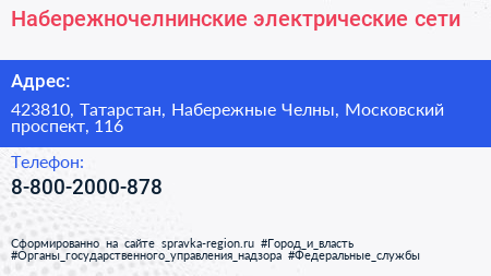 Набережночелнинские электрические сети по адресу 423810, Татарстан, Набережные Челны, Московский проспект, 116 в дальнейшем Организация, размещена в следующих категориях: