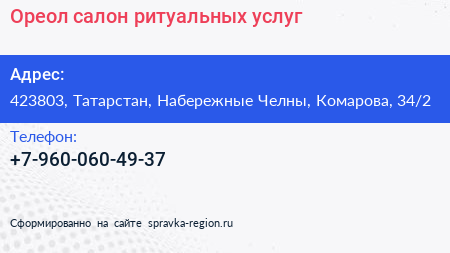 Ореол, салон ритуальных услуг по адресу 423803, Татарстан, Набережные Челны, Комарова, 34/2 в дальнейшем Организация, размещена в следующих категориях: