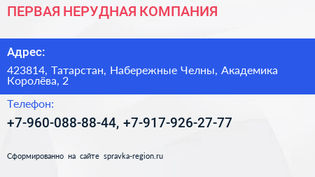 ПЕРВАЯ НЕРУДНАЯ КОМПАНИЯ по адресу 423814, Татарстан, Набережные Челны, Академика Королёва, 2 в дальнейшем Организация, размещена в следующих категориях: