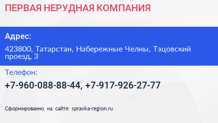 ПЕРВАЯ НЕРУДНАЯ КОМПАНИЯ по адресу 423800, Татарстан, Набережные Челны, Тэцовский проезд, 3 в дальнейшем Организация, размещена в следующих категориях: